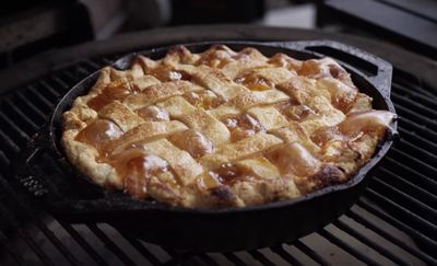 Bake in a temperature range between 375°F-425°F on your grill for at least one hour, up to an hour and a half. The center should be bubbling when finished.